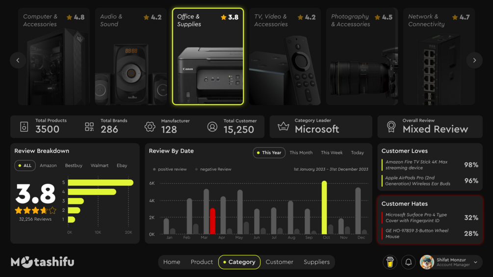 Customer review dashboard developed for ecommerce category managers to streamline customer feedback analysis. As a category manager, understandign consumer sentiments is vital in shaping strategic decisions. That's where our dashboard shines.