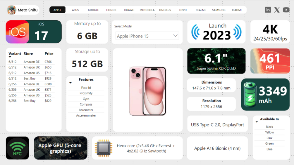 This clean and user-friendly Power BI dashboard simplifies smartphone comparisons by showcasing only the most essential details—memory, storage, display, battery, and pricing—at a glance. Easily filter by model and find the right information without distractions.