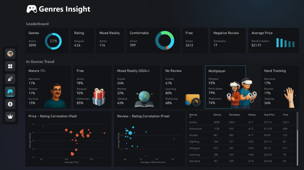 This dashboard highlights trends in genres, user ratings, comfort levels, pricing, and gameplay modes, offering insights into what drives popularity and performance in the VR gaming market.